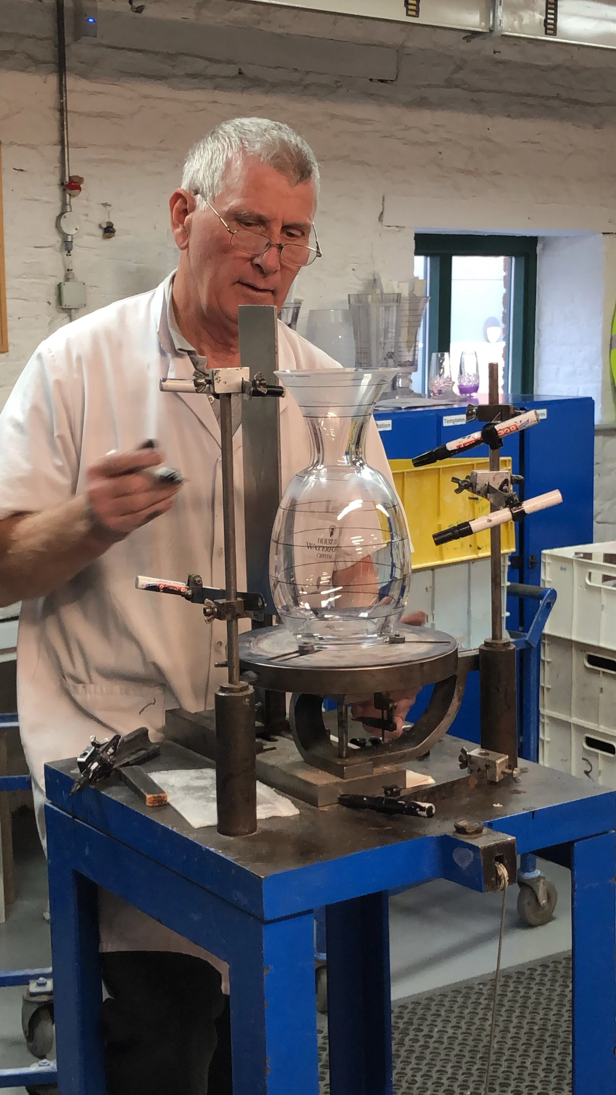 Hand-drawing the lines where the crystal will be cut at Waterford Factory.
