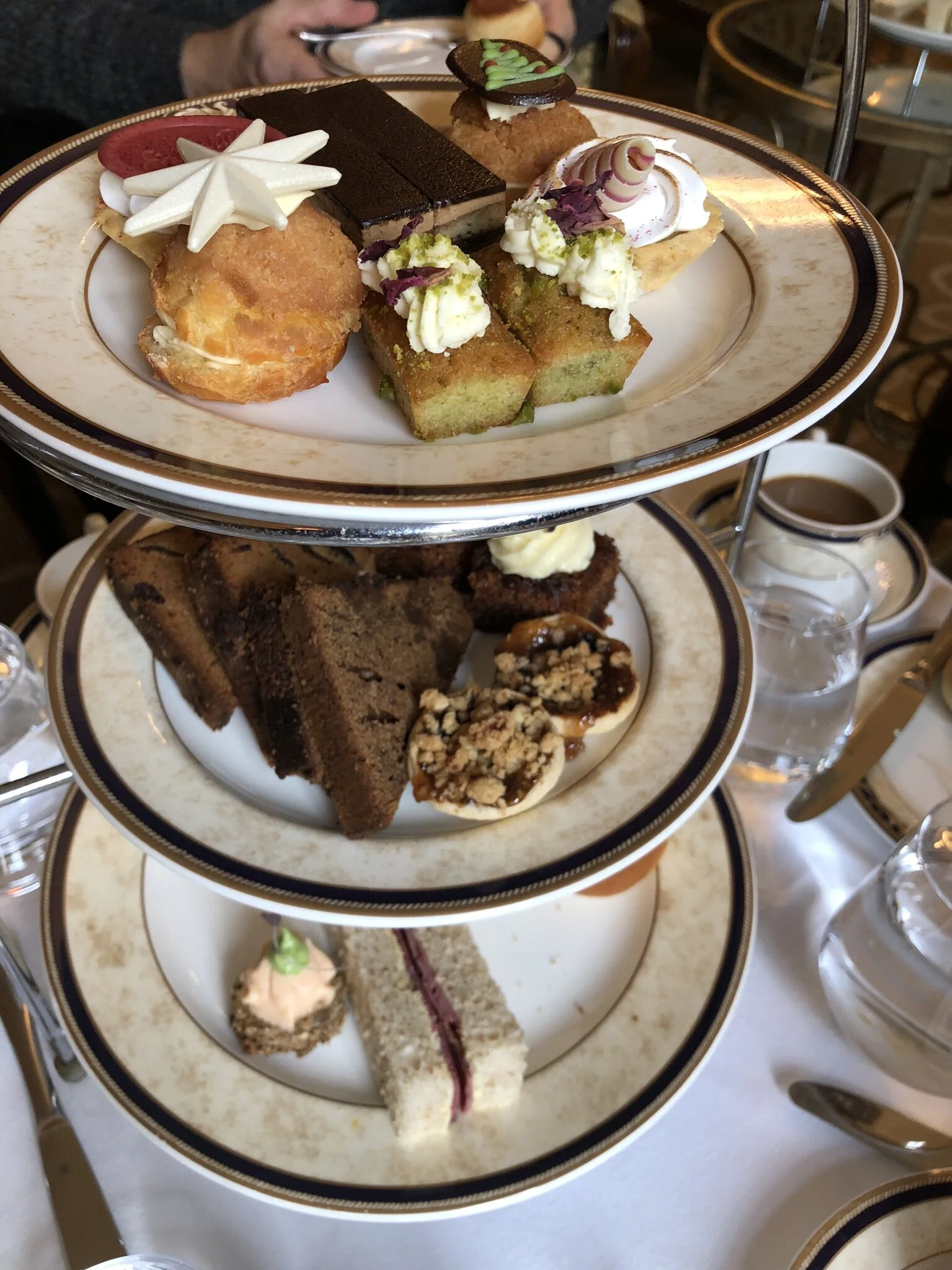 I had made reservations for us to have afternoon tea at the hotel before we headed to the Blarney Castle. Tea was so good, I couldn’t believe it. We sat in a cozy room with a twinkling Christmas tree. There was coffee, tea, and champagne. The tea trays that arrived were gorgeous and so so yummy. Each person got their own piece of everything to try it all. The cucumber sandwiches were my favorite.